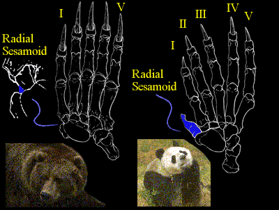 It turns out that grizzly bears do not have this enlarged radial sesamoid. It also turns out that giant pandas have this enlarged radial sesamoid in their hind feet as well.