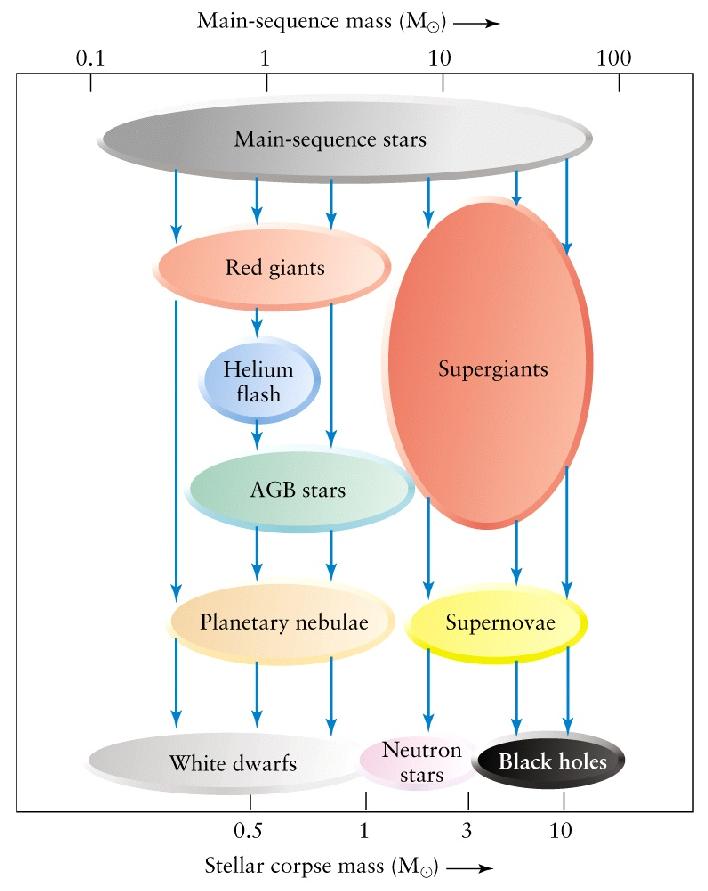 The specific fate of a post-main sequence star depends on the star's main sequence mass. Less massive stars form planetary nebulae (next slide) while very massive stars form black holes (two slides forward).