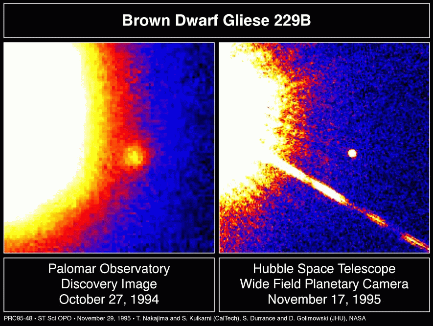 Left: Discovery image of the first confirmed brown dwarf (GL 299B). Right: Hubble Space Telescope image of the same target.