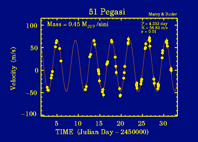 The radial velocities can be plotted against time and you see a nice periodic variation. This is the planet orbiting its star and tugging on the star.