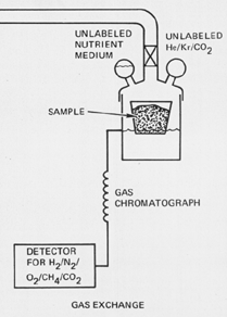"The GEX experiment partially submerged a 1-cc sample of soil in a complex mixture of compounds the investigators called "chicken soup". The soil would then be incubated for at least 12 days in a simulated martian atmosphere of CO2, with helium and krypton added. Gases that might be emitted from organisms consuming the nutrient would then be detected by a gas chromatograph -- this instrument could detect CO2, oxygen (O2), CH4, hydrogen (H2), and nitrogen (N2)."