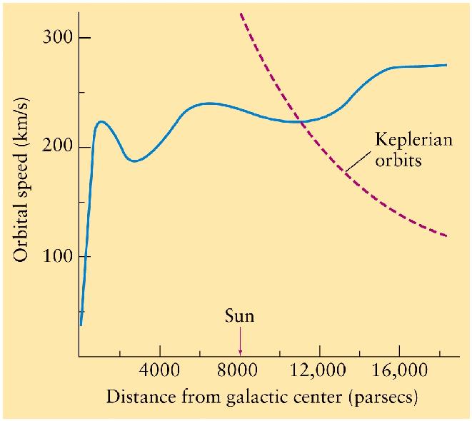Another interesting and bizarre thing about our spiral galaxy -- and many others, too -- is the rotation curve of the galaxy (recall Kepler's third law).