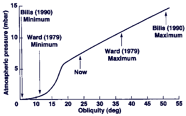 Remember that Mars' obliquity changes -- this can have an effect on the atmospheric pressure, which in turn can affect whether liquid water is possible on the surface of Mars.