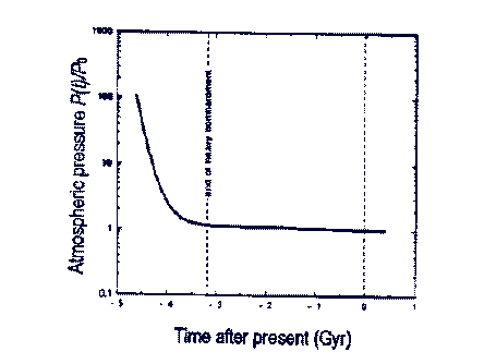 It has also been suggested that Mars had an early atmosphere -- around 4 billion years ago -- that was 100 times more massive than its present atmosphere. This early, massive atmosphere could have been entirely driven off through multiple collisions of asteroids onto Mars.